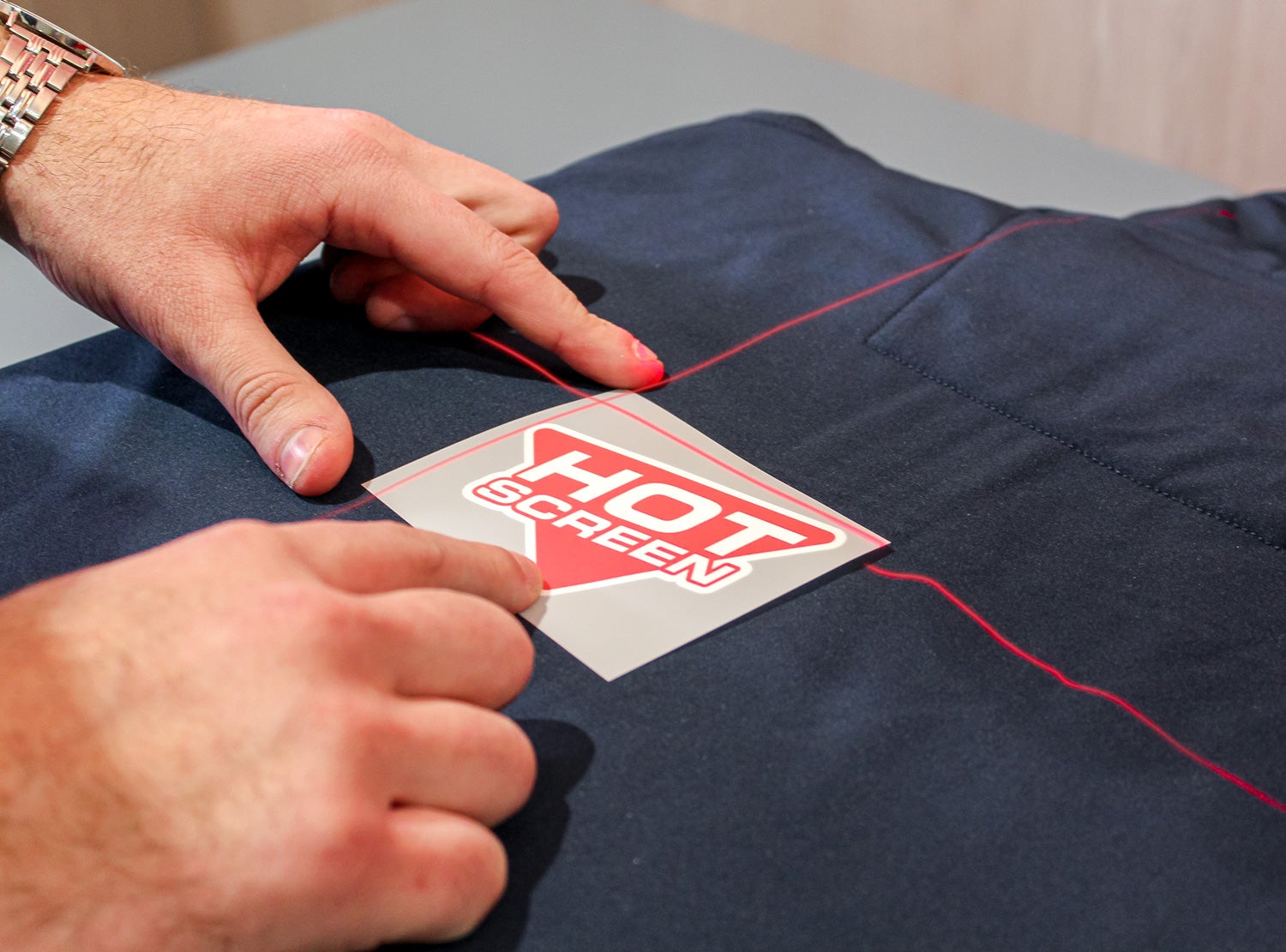 A cross laser used to always get the same placement of the transfer on the garment while applying.